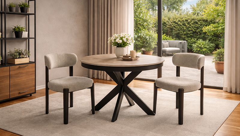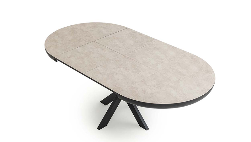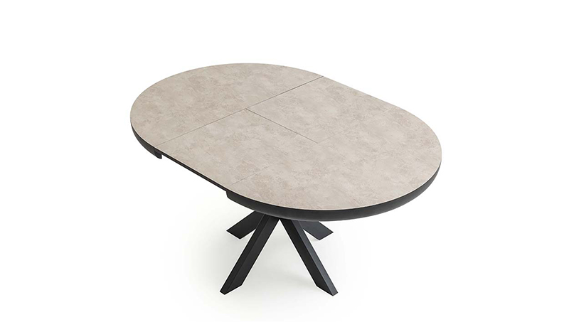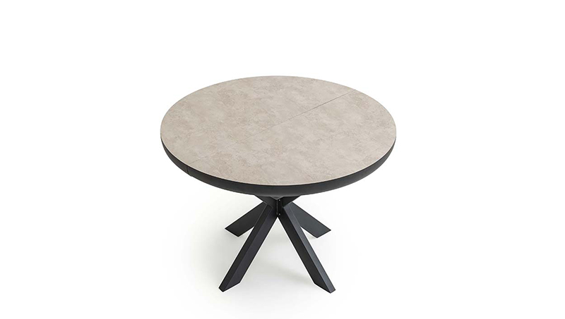Ένα υπέροχο τραπέζι φαγητού που αντιπροσωπεύει τον minimal και κομψό σχεδιασμό. Εχει στρογγυλό σχήμα επιφάνειας και μεταλλική βάση στηριξής με ηλεκτροστατική βαφή. Διαθέτει δύο προεκτάσεις που επεκτείνουν την επιφάνεια του τραπεζιού, ανάλογα με τις θέσεις που χρειαζόμαστε.