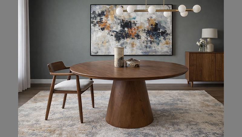 Το στρογγυλό τραπέζι φαγητού Plus δίνει μια αρμονία στον χώρο.  Ο σχεδιασμός του βασίζεται σε καμπύλες  τόσο στην επιφάνεια όσο και στην βάση του τραπεζιού.  Αποτελείται από επένδυση ξύλου δρυς. Υπάρχει η δυνατότητα επιλογής χρώματος λούστρου.