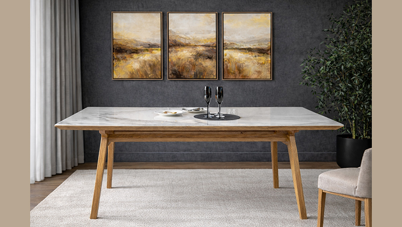 Τραπέζι φαγητού με τεχνητή πορσελάνη και  ξύλινα μασίφ πόδια. Το υλικό κατασκευής της επιφάνειας του έχει αντιχαρακτικές και άθραυστες ιδιότητες όσον αφορά το σπάσιμο και το θάμπωμα. Υπάρχει η δυνατότητα επιλογής του χρώματος και της διάστασης.